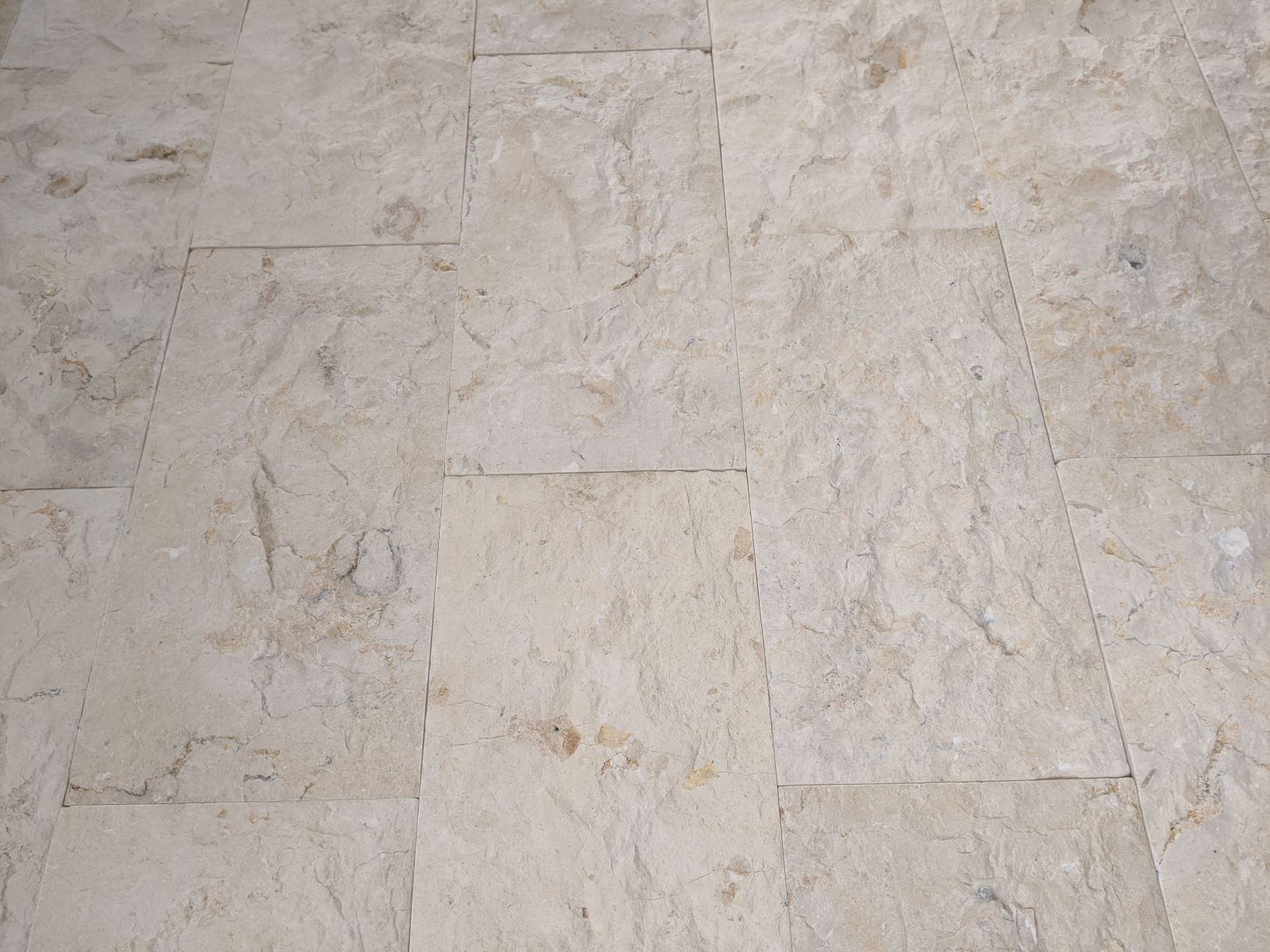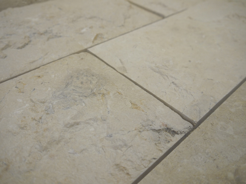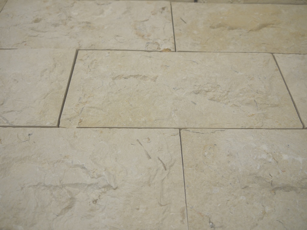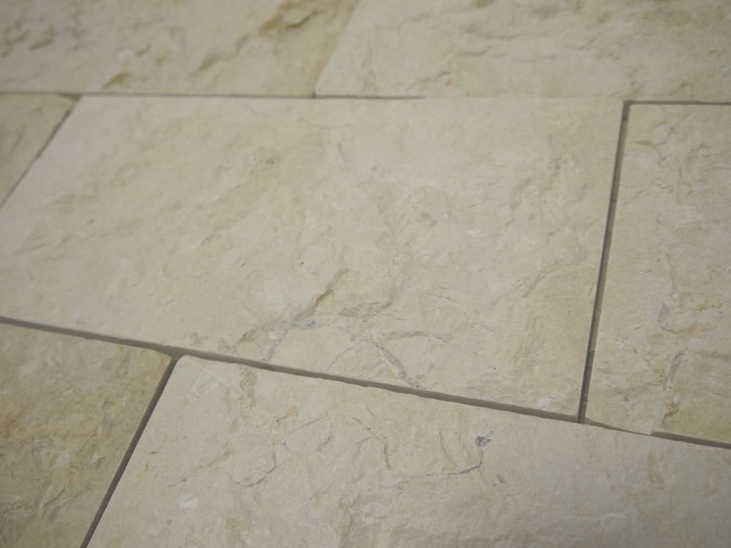 A unique choice. This Jerusalem Limestone tile has been heavily chiselled to give a rich and tactile texture and each tile has a ‘belly’, in other words thinner edges and thicker middle!